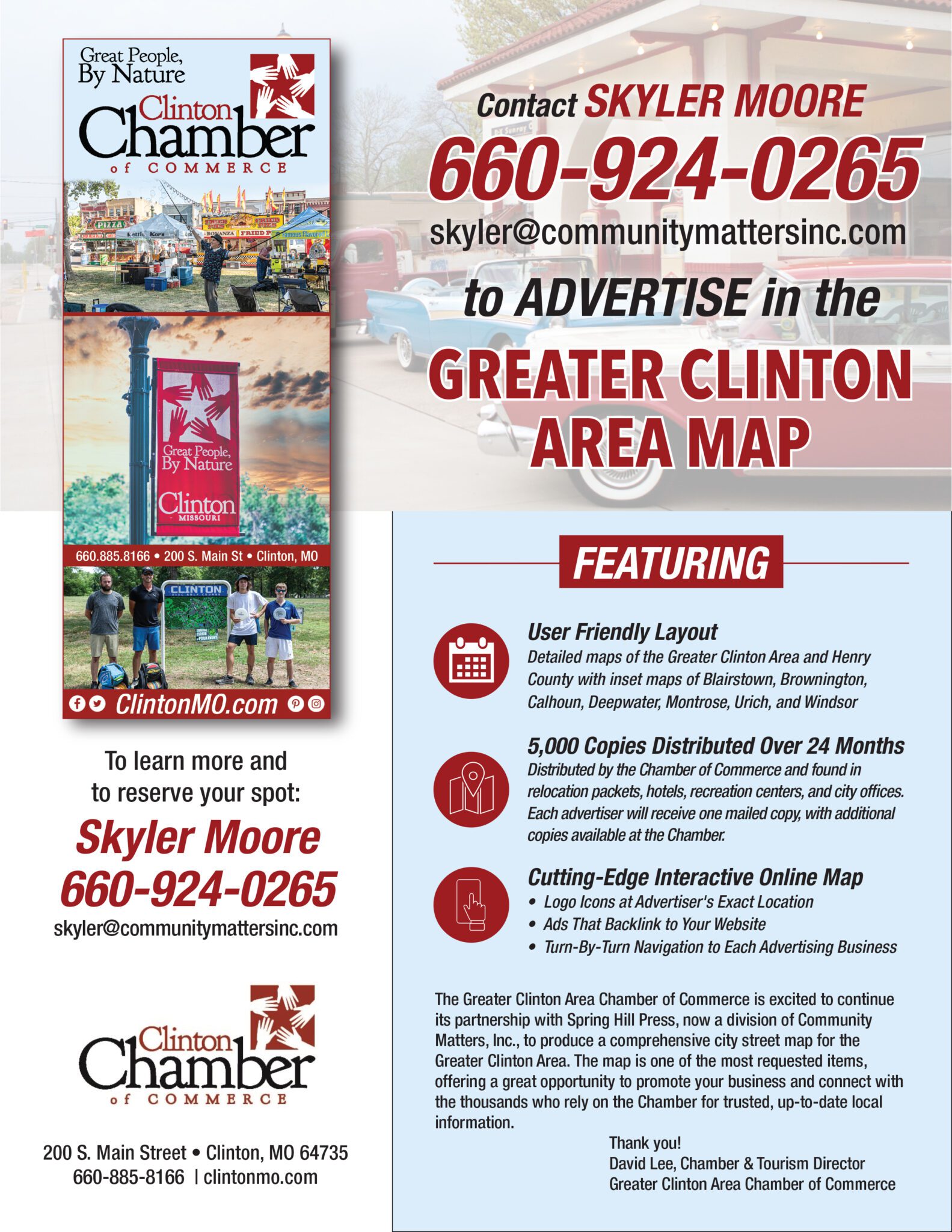 Be seen by new residents, businesses, visitors & locals at 50+ distribution points including: the Chamber of Commerce, Relocation Packets, Hotels, Recreation Centers, City Offices and each business advertising on the map